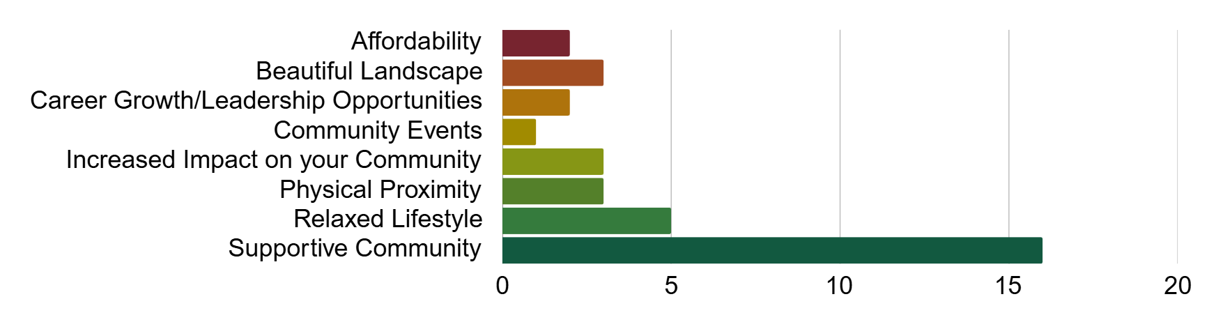 The supportive, tight-knit nature of regional communities stood out well above all other responses. Many alumni spoke of the comfort and connection that comes from knowing your community is looking out for you. In contrast to the anonymity often felt in larger cities, regional life offers a deep sense of being seen, supported, and valued.